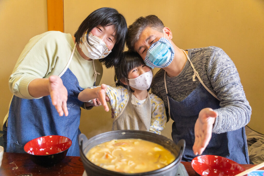 ほうとう、吉田のうどん、忍野八海蕎麦。山梨の郷土料理を一緒に作りながら、自然な笑顔をそのまま写真に残します。